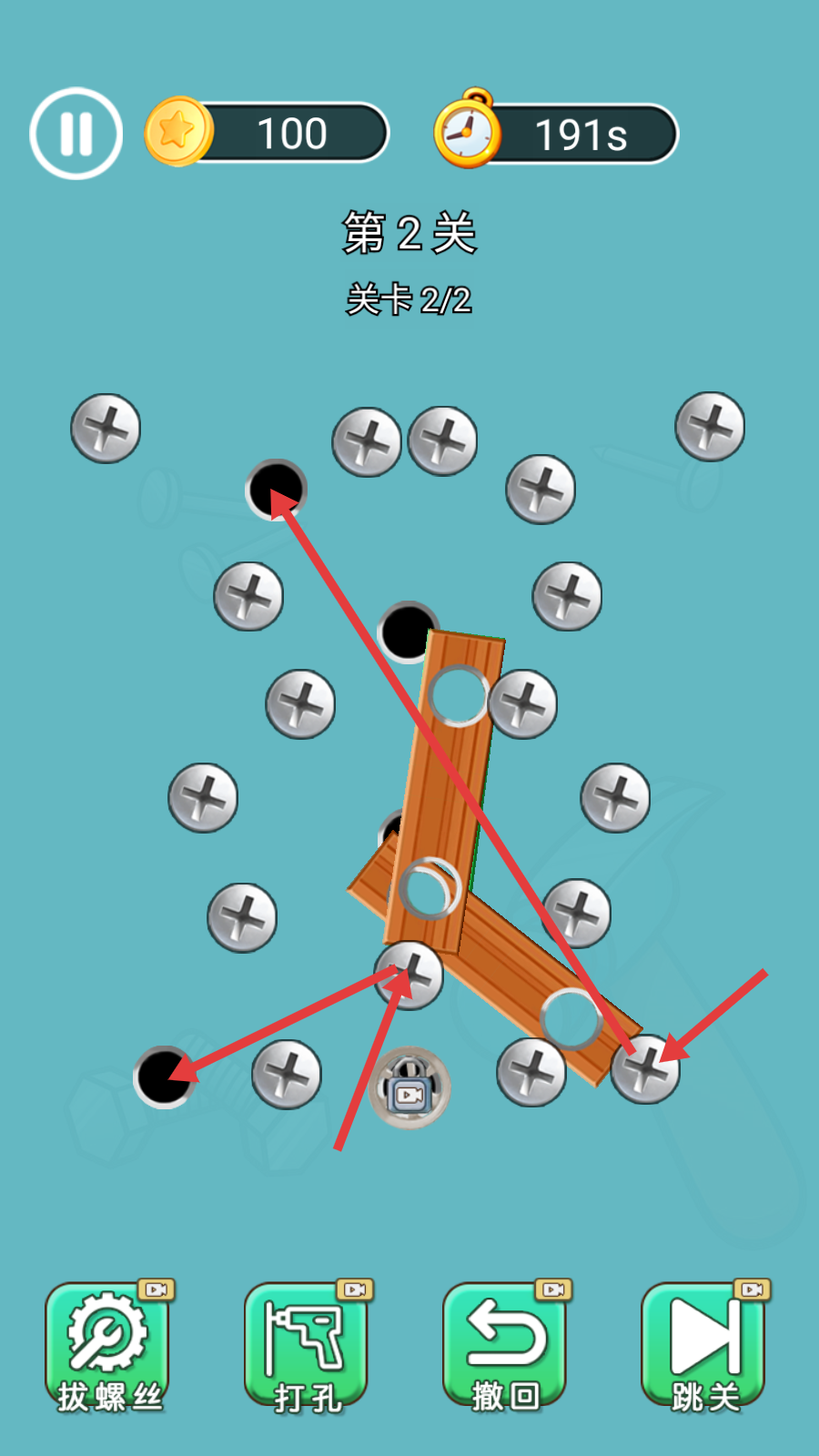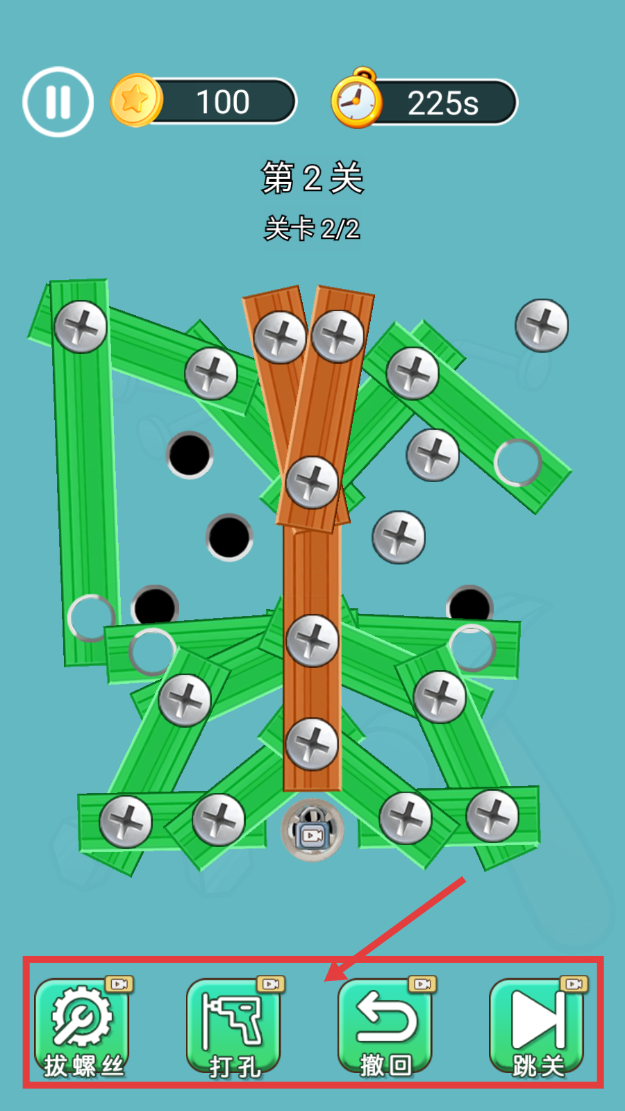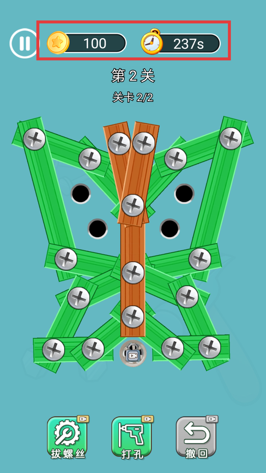 1、第2关开始,留意上方【100-金币】与【237s-时间】,先观察螺丝分布,优先规划处理关键位置的螺丝,为后续木板松动铺路。