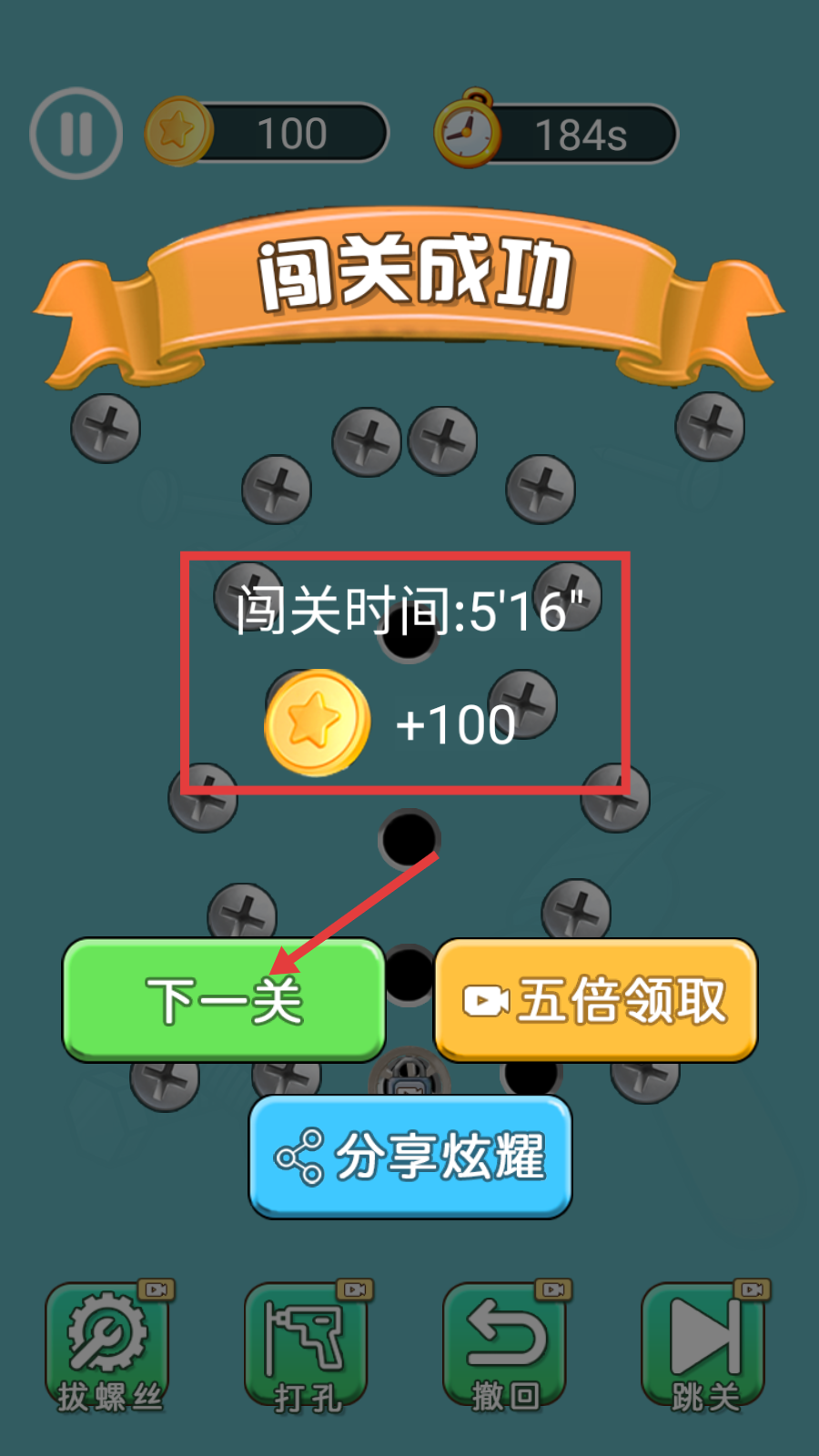 4、成功移除关键螺丝后即可通关,获得【闯关时间:5'16"】和【+100-金币】,可点击【下一关】继续。