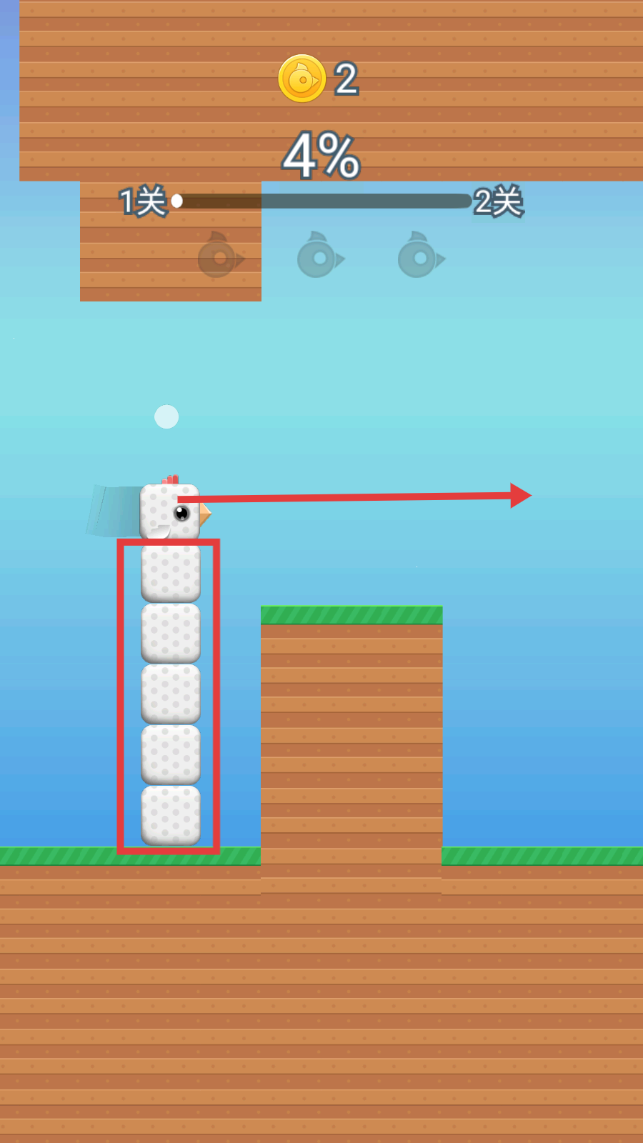 2、挑战过程中,操控方块堆叠的角色向右移动,利用方块的堆叠来跨越地形,此时上方会显示当前获得的【2-金币】与关卡进度。
