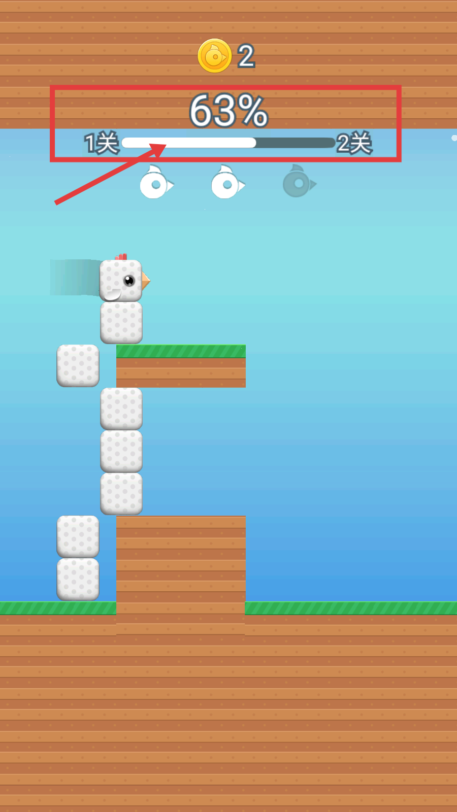 3、持续操控角色移动,留意上方的关卡进度条,当进度达到【63%-1关到2关】时,继续保持移动节奏,稳步推进关卡进度。