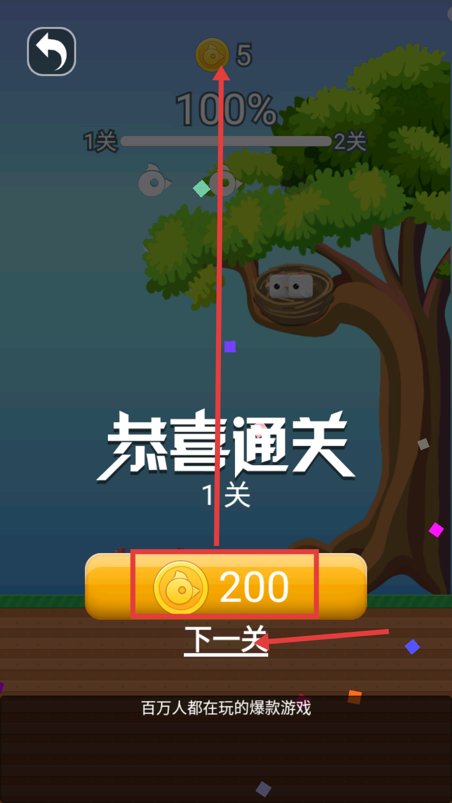 4、成功通关第1关后,界面会显示【恭喜通关-1关】,并获得【200-金币】,点击【下一关】按钮即可进入下一个关卡继续挑战。