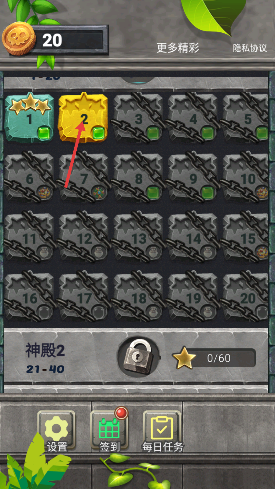 1、在关卡选择界面,点击标有【2】的黄色关卡图标,进入第2关,此时可查看当前拥有的金币,为关卡挑战做好准备。