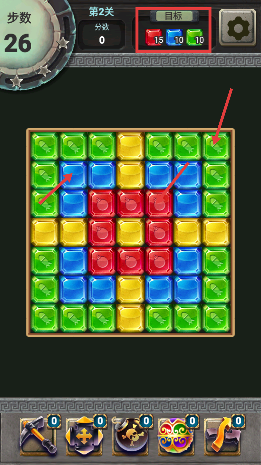 2、第2关开始后,关注上方【目标-红15-蓝10-绿10】的消除要求,观察宝石布局,优先选择同色宝石密集的区域,规划消除步骤。