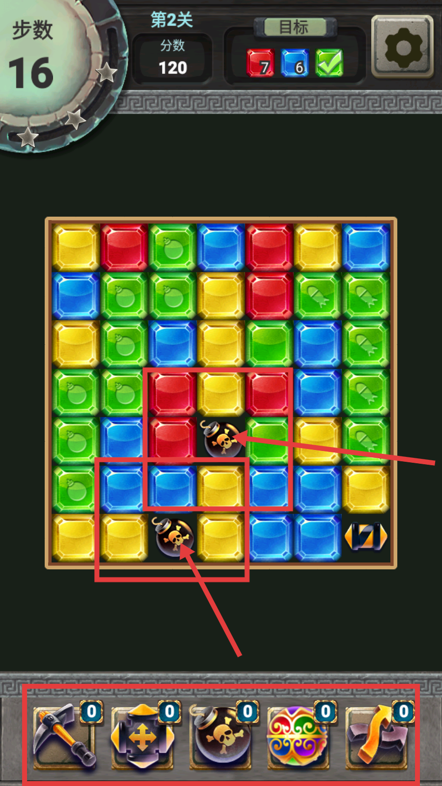 3、挑战中留意左侧【步数】限制,当出现炸弹道具时,合理利用它消除大范围宝石,底部的工具道具也可在关键时使用,助力完成消除目标。