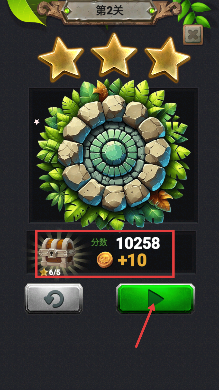 4、成功完成所有宝石消除目标后,即可通关第2关,获得【分数10258】与【+10-金币】,还能获得三星评价,点击绿色按钮可进入下一关。
