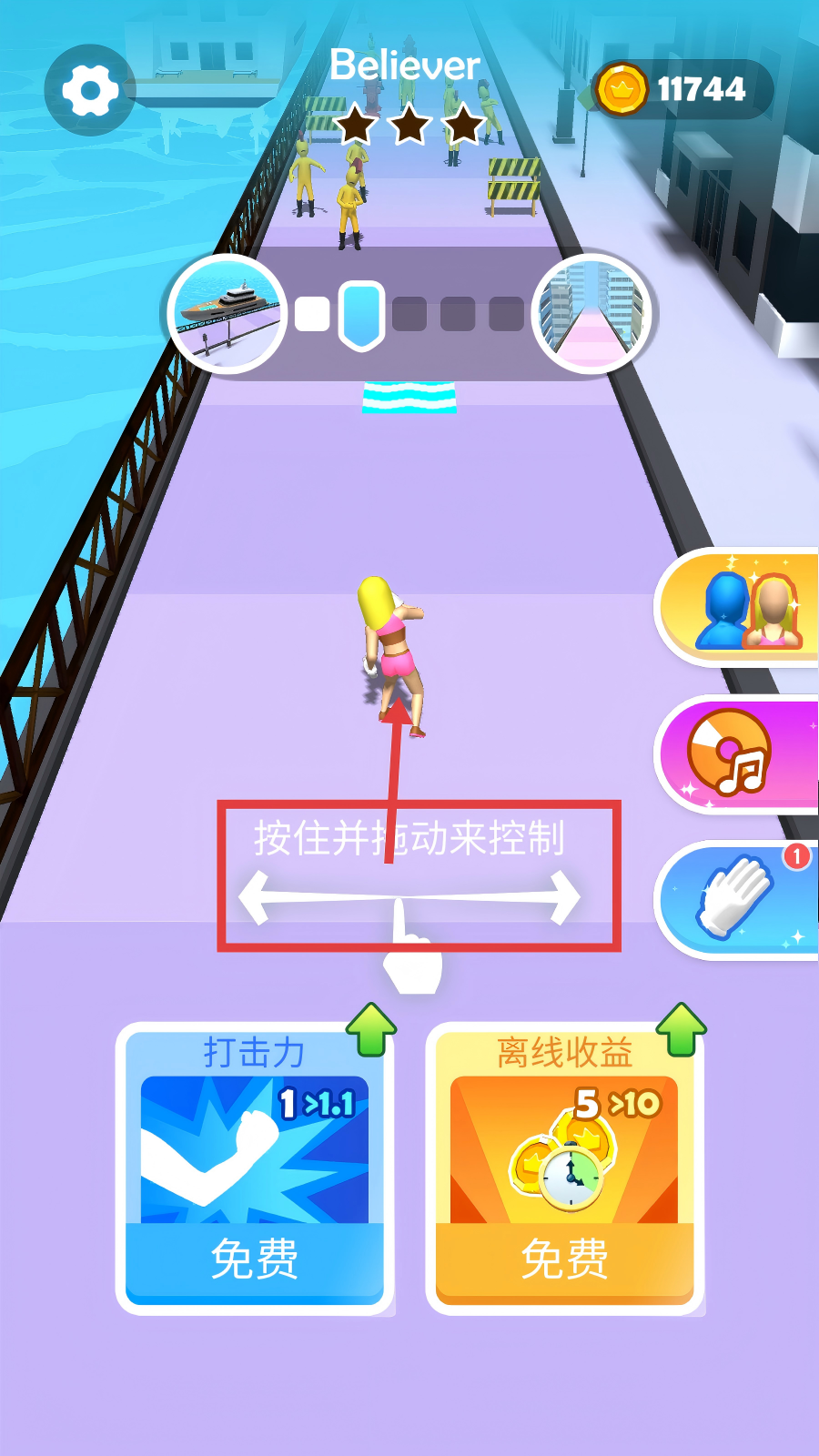 1、进入游戏后,按住并拖动屏幕控制角色移动,可先免费提升【打击力-1>1.1】等属性,同时留意当前拥有的金币数量,为闯关做准备。
