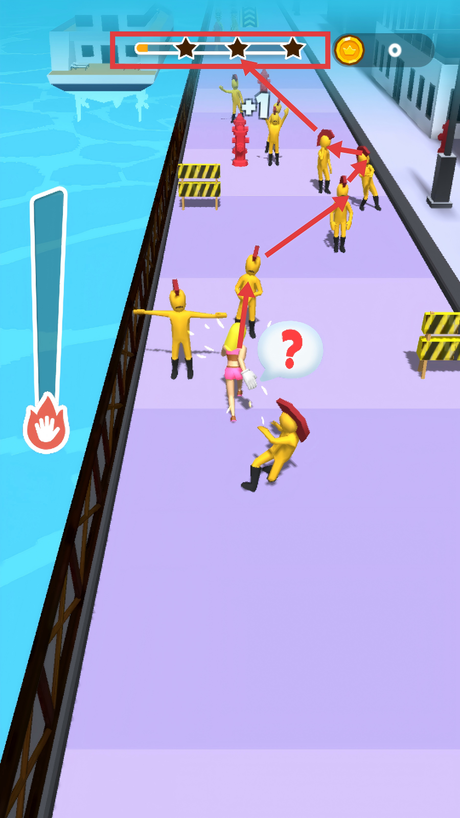 2、闯关过程中,沿着路径移动,遇到黄色敌人时与之互动,上方的星级进度条会随操作推进,注意避开障碍物,稳步提升关卡进度。