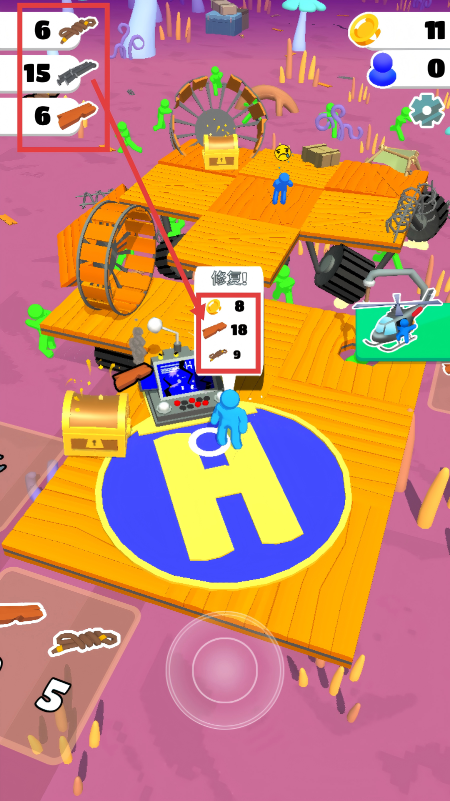 3、看到【修复!】提示时,凑齐【8-金币】【18-木材】【9-绳索】等资源就进行修复,完善基地设施。