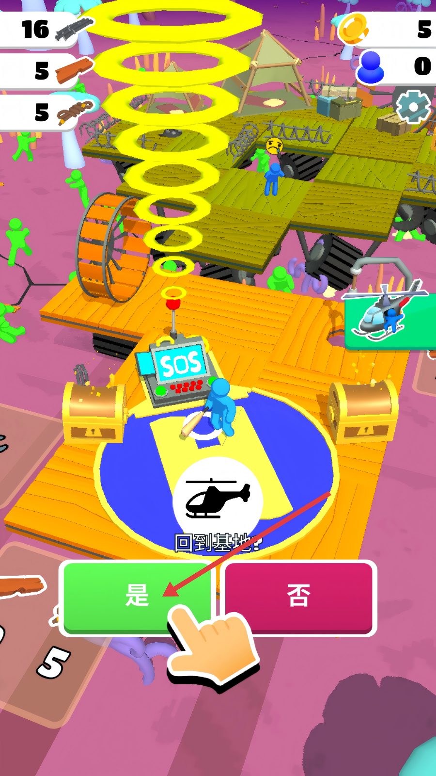 4、出现【回到基地?】提示时,点击【是】,将收集的资源带回基地,为后续阶段做准备。