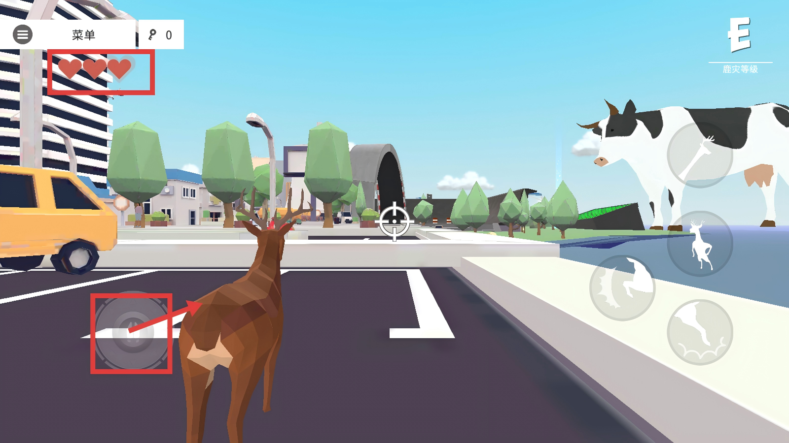 4、点击右侧攻击按钮,能对场景中的物体进行破坏,破坏过程中还能提升右上角的【鹿灾等级】,体验搞怪破坏乐趣。
