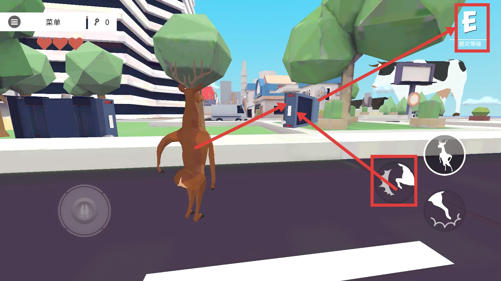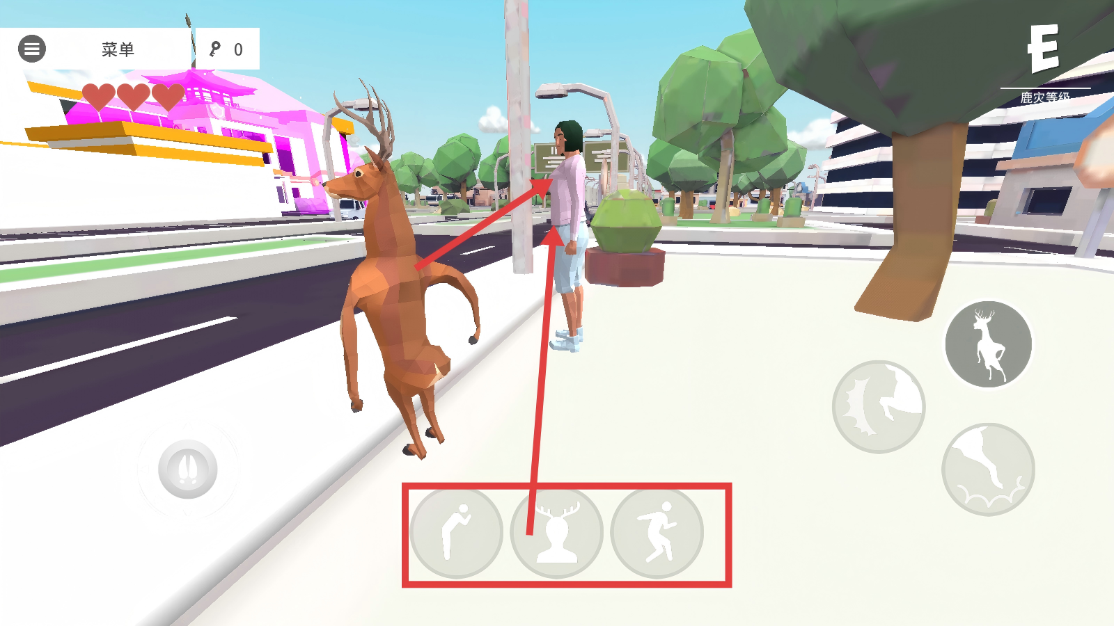 3、下方的动作按钮很关键,可操控鹿做出不同动作,靠近场景里的人物时,用这些按钮和人物互动。