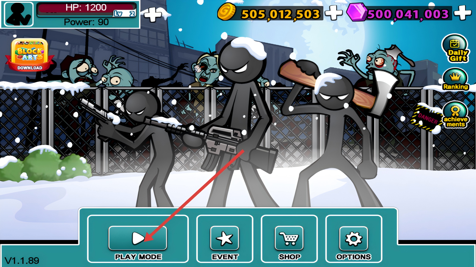 1、进入游戏主界面,点击【PLAY-MODE】按钮,即可开启火柴人对抗僵尸的冒险,准备利用资源战斗。