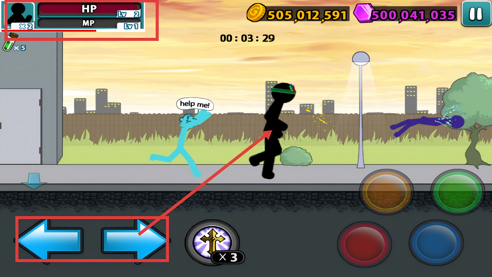 2、在关卡中,用左下角左右箭头按钮控制移动,留意左上角【HP】与【MP】数值,遇到喊【help-me!】的角色记得互动救援。