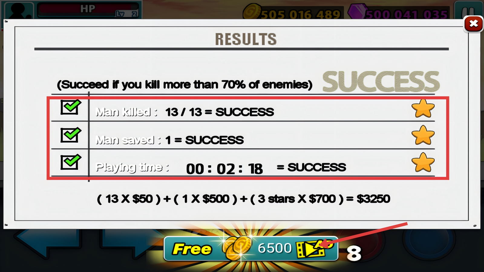 4、通关后会显示【RESULTS】界面,完成敌人击杀、人员救援、限时挑战等目标,可获得三星评价与金币奖励。