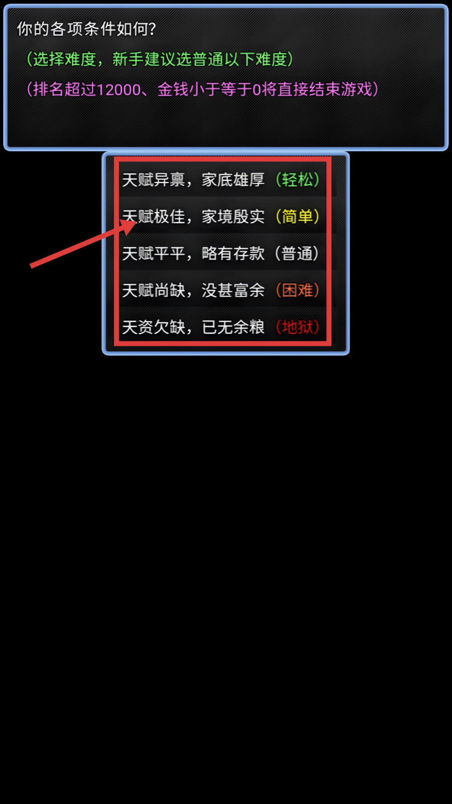 2、在难度选择界面,新手建议选择【天赋极佳,家境殷实-简单】难度,能更轻松开启电竞成长。