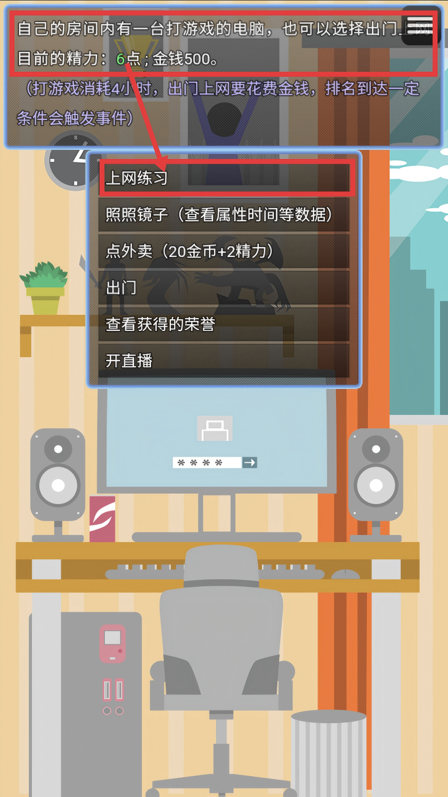3、在自己的房间内,当精力与金钱充足时,点击【上网练习】选项,消耗时间来提升游戏相关属性。