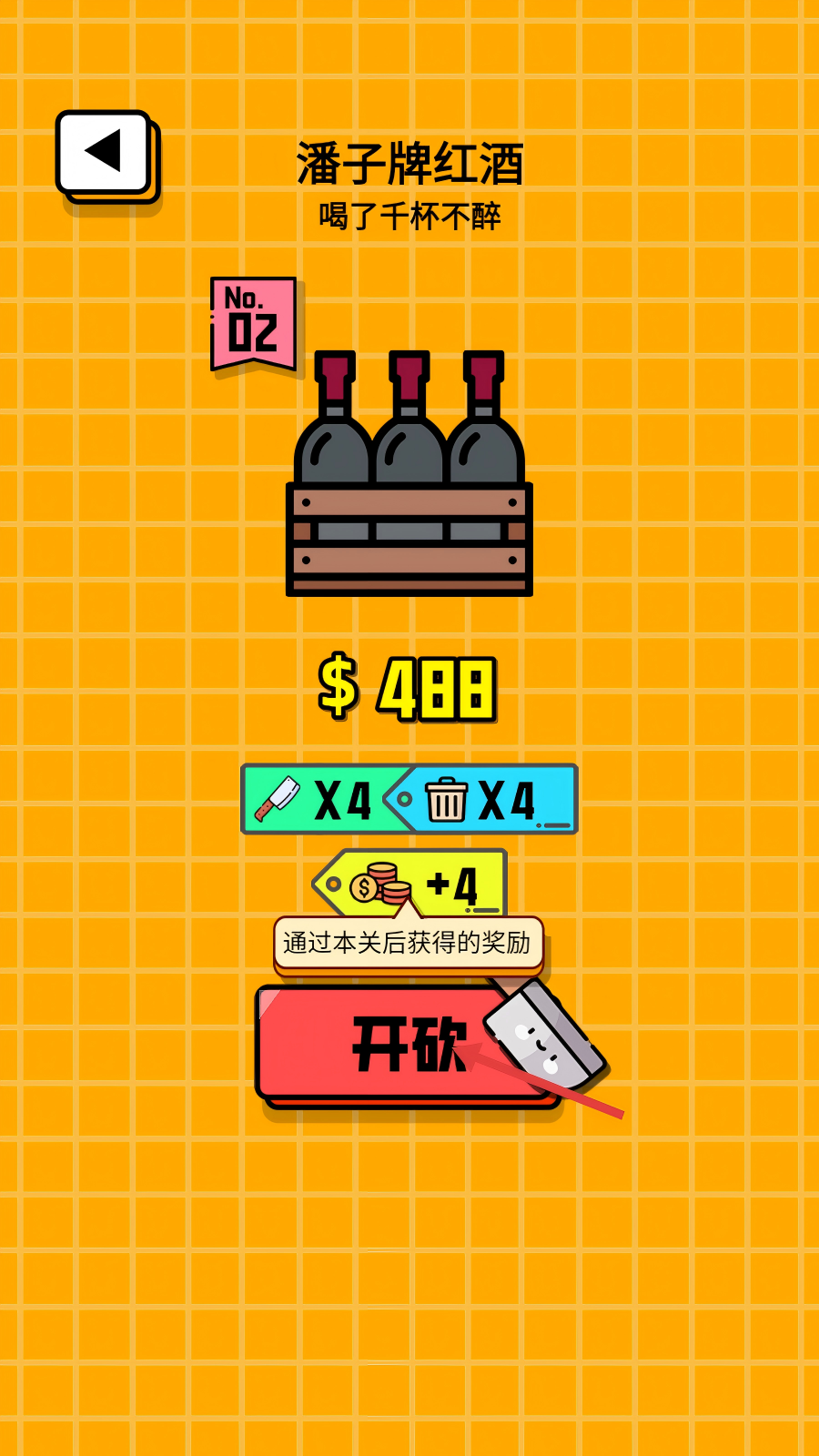 1、挑战【潘子牌红酒】关卡时,点击红色【开砍】按钮,即可开启本关砍价,争取获得通关奖励。