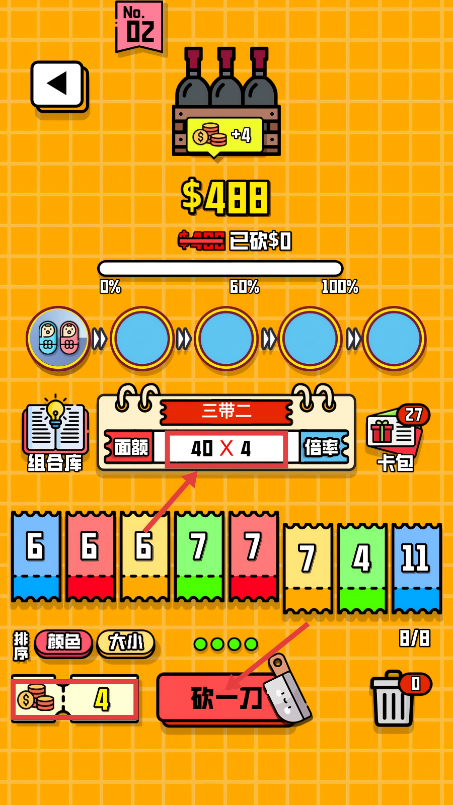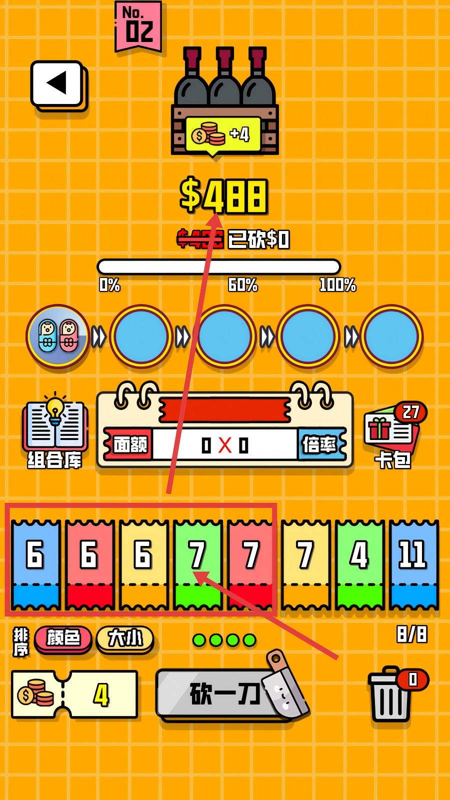 3、当票据形成“三带二”等有效组合后,点击【砍一刀】按钮,利用组合来削减红酒价格,推进关卡。