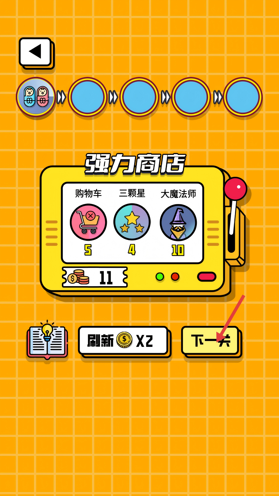 4、成功通关后进入【强力商店】,可选购道具或直接点击【下一关】按钮,继续挑战新的关卡。