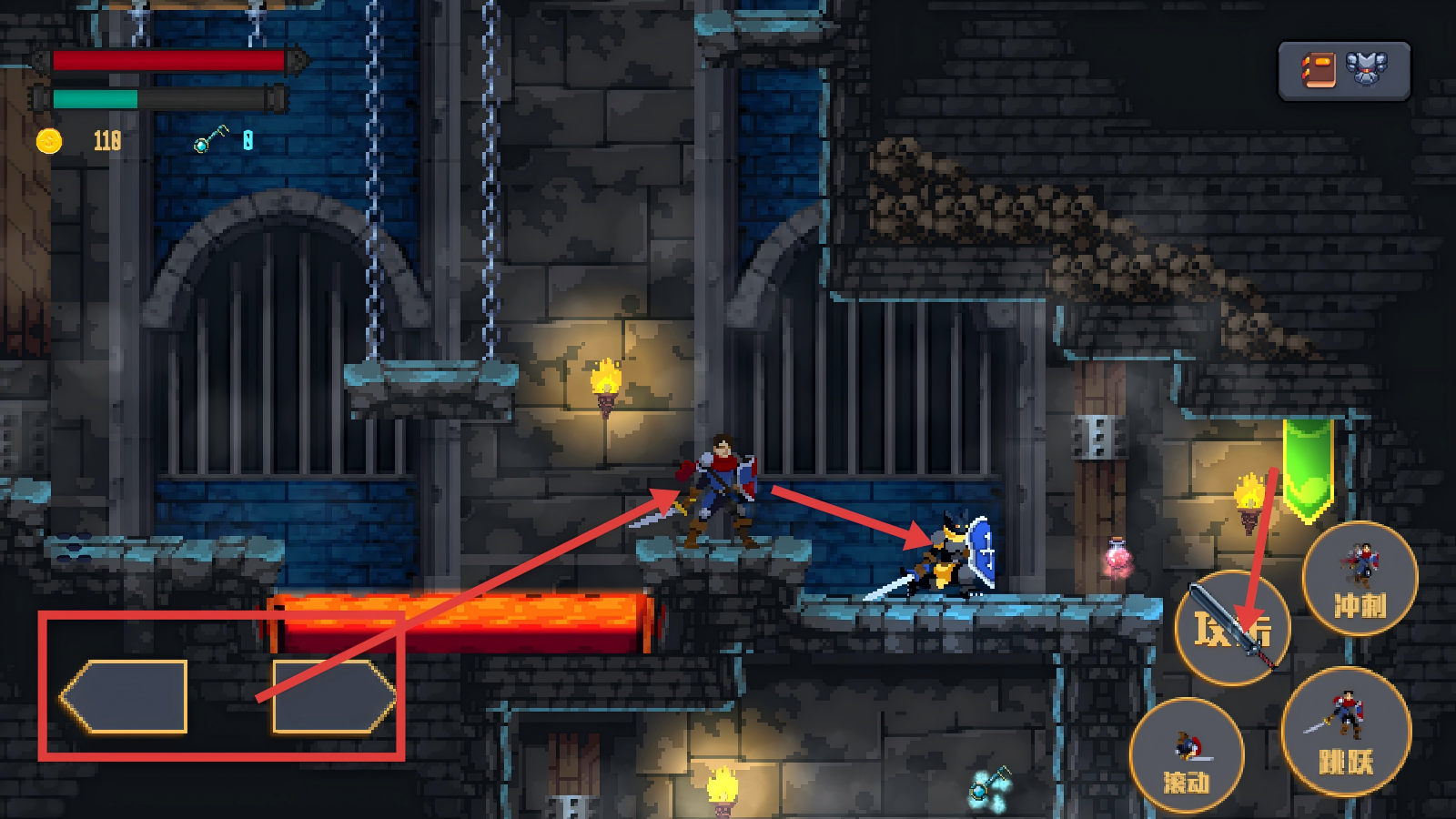 2、操控角色时,用左侧左右箭头按钮移动,右侧“攻击”“冲刺”“滚动”“跳跃”按钮可应对不同情况,遇到敌人就点“攻击”按钮战斗。