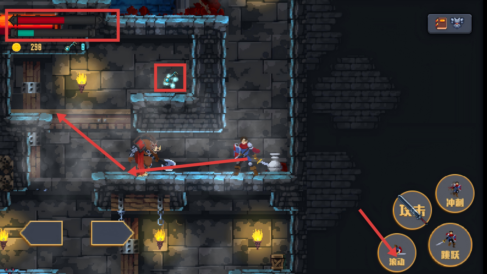 3、冒险中留意左上角生命值(红、绿色条),尽量收集场景里的道具;碰到敌人时,也能借助“滚动”等操作灵活躲避或反击。