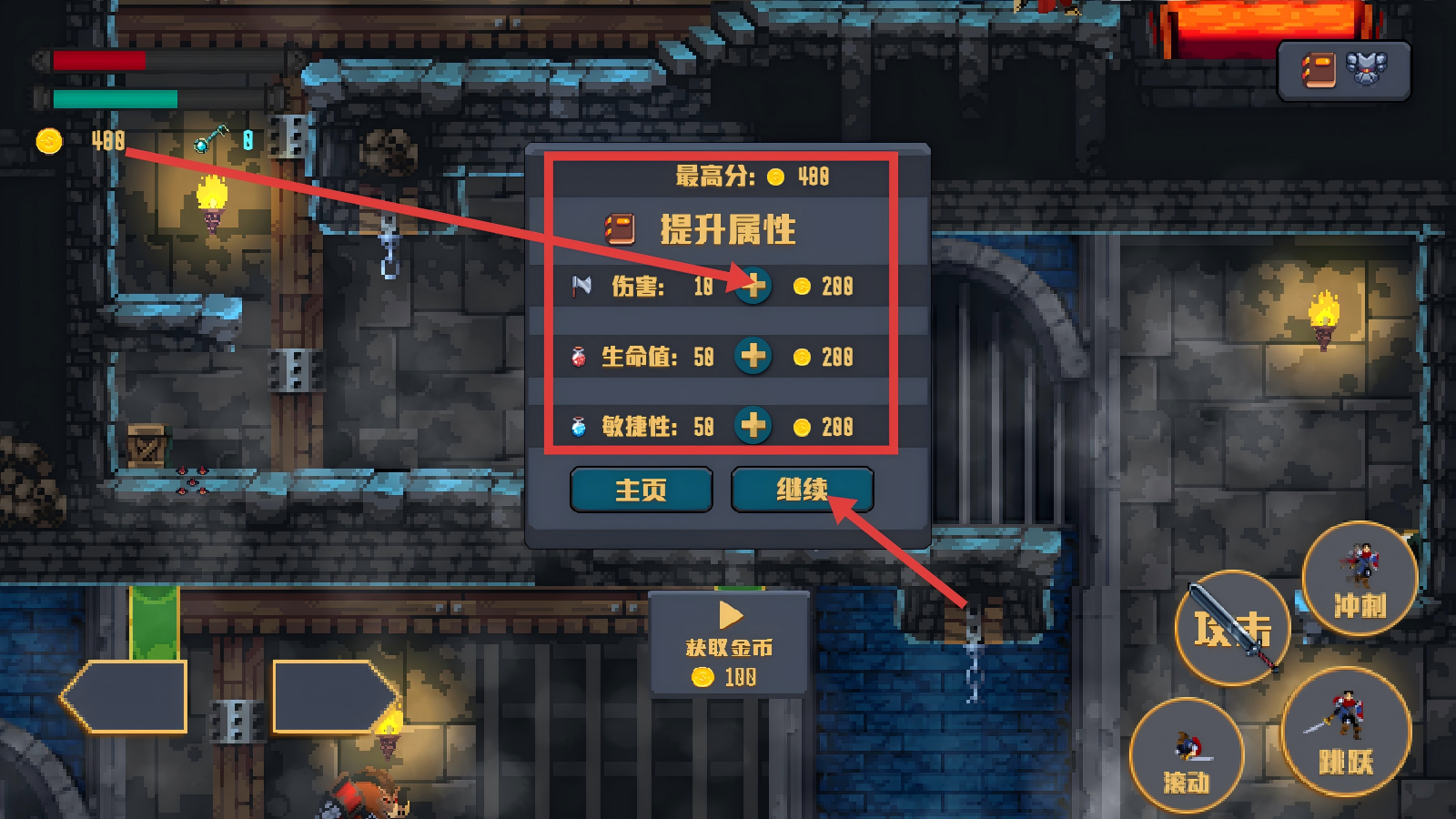 4、通关后,可用获得的金币提升“伤害”“生命值”“敏捷性”等属性,让角色更强,提升后点击“继续”,继续探索城堡。