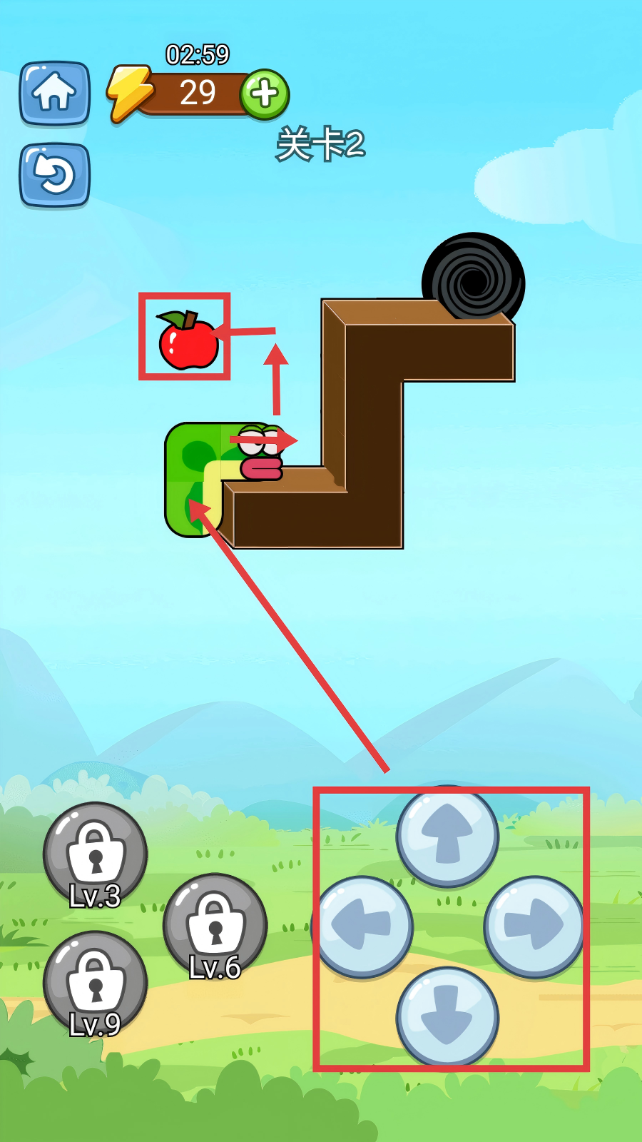 2、在【关卡2】,用下方方向键操控小蛇移动,先朝着苹果方向前进,获取道具推进游戏。