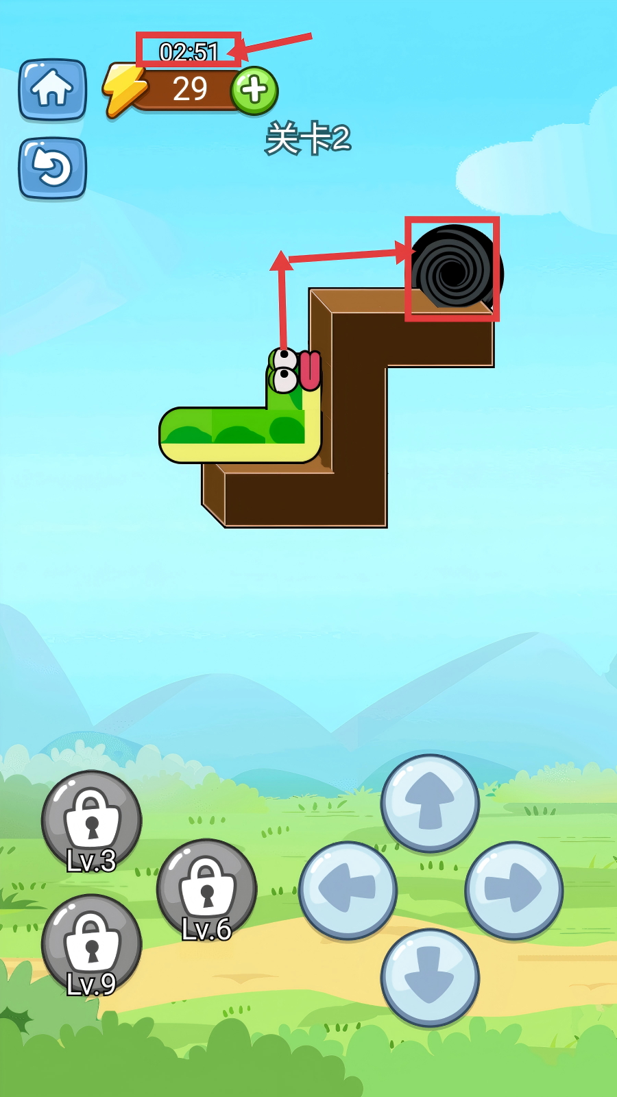 3、吃掉苹果后,继续用方向键操控小蛇,朝着【黑洞】方向移动,注意剩余时间,尽快抵达目标。