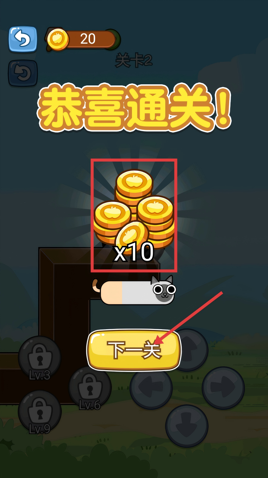 4、成功到达黑洞后,即可通关获得【x10】金币奖励,接着点击【下一关】挑战后续关卡。