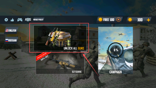 1、如何解锁武器?在游戏主界面,点击“UNLOCK ALL GUNS”按钮来解锁所有武器。
