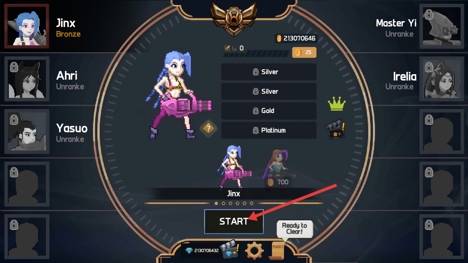 1、选择角色【Jinx】后,点击【START】按钮,开启游戏征程,可体验新手流程。