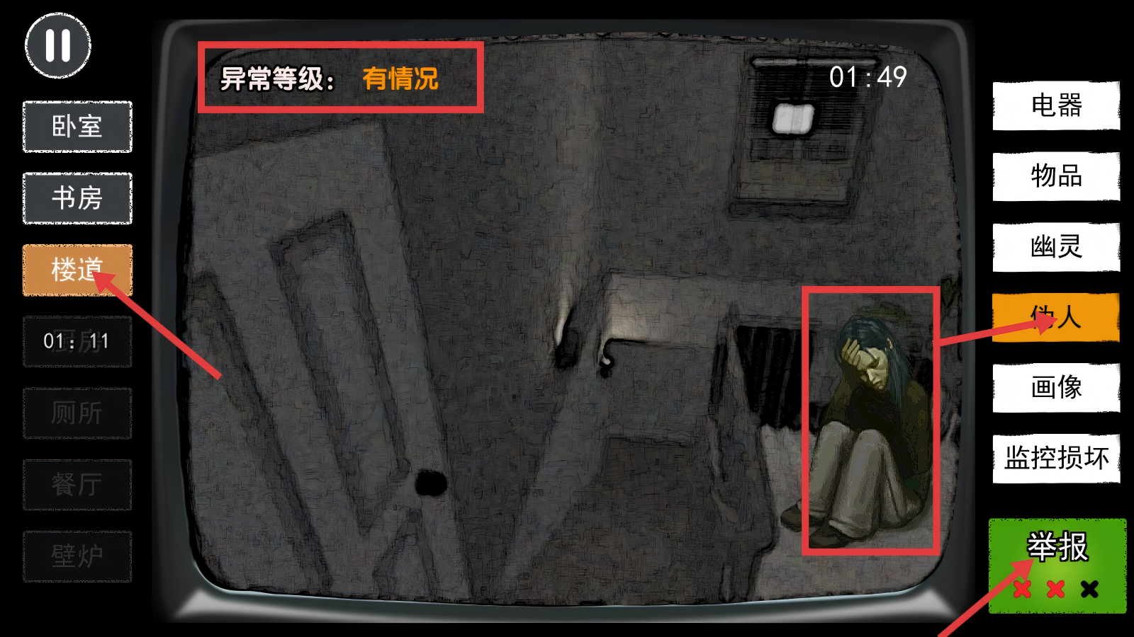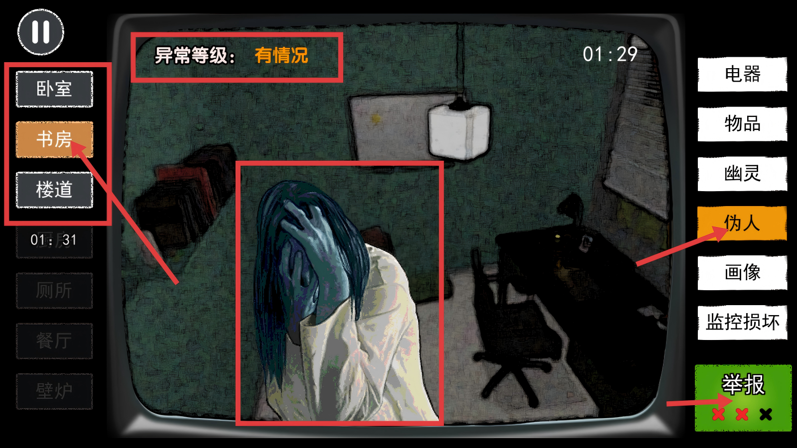 2、切换至【书房】监控画面,发现“伪人”后,选择右侧【伪人】标签,点击绿色【举报】按钮,处理该异常。