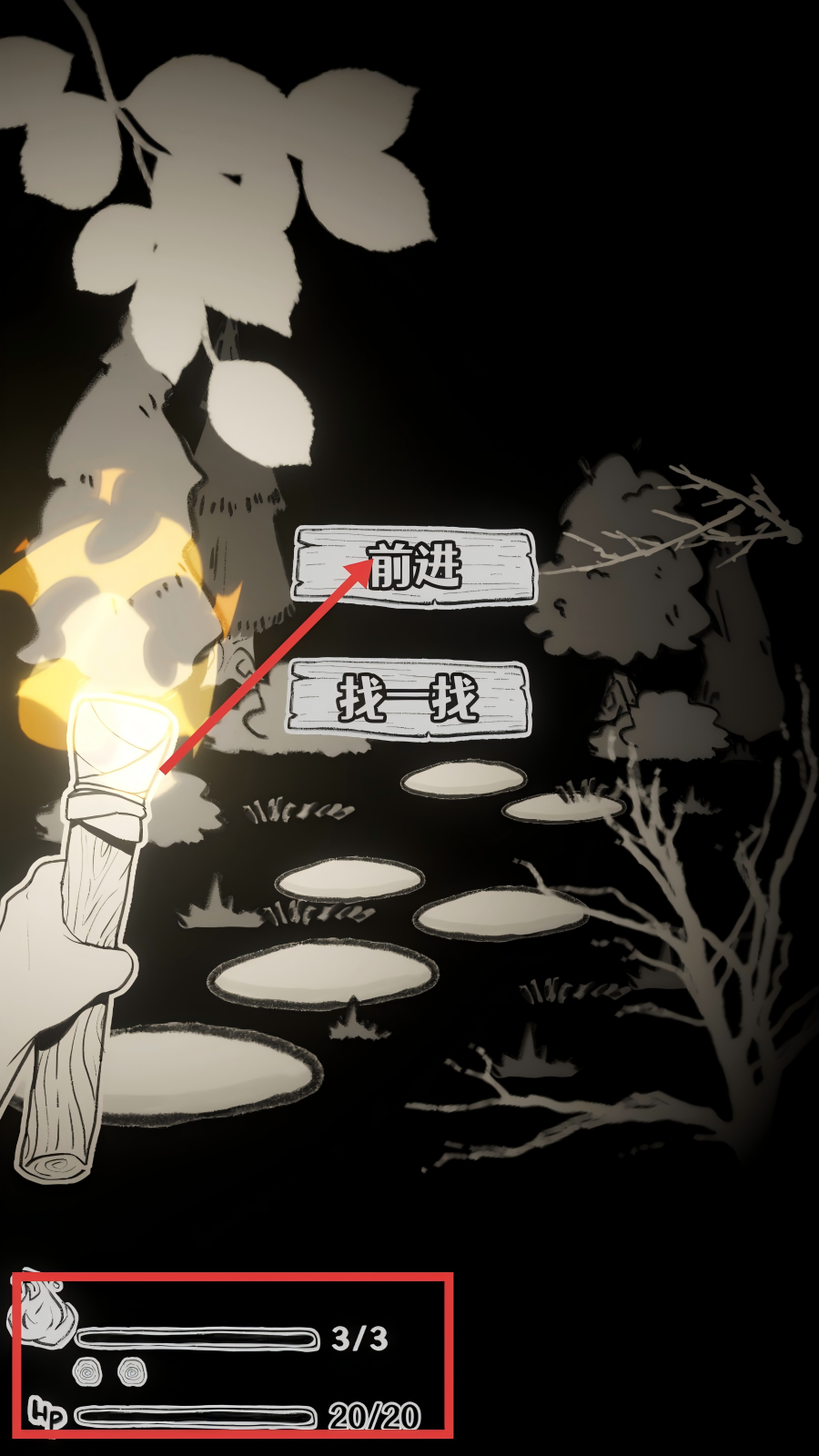 1、开局在黑暗场景中,优先点击【前进】探索,同时留意左下角【HP-20/20】等状态,保持资源充足,为后续遭遇做好准备。