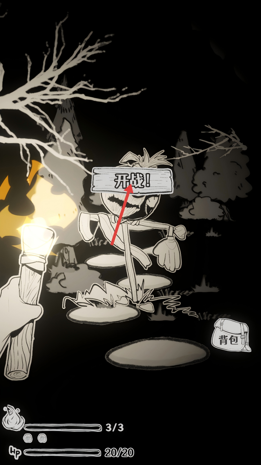 2、遇到稻草人敌人时,点击【开战!】进入战斗,战斗前可查看【背包】确认道具,确保有足够手段应对敌人。