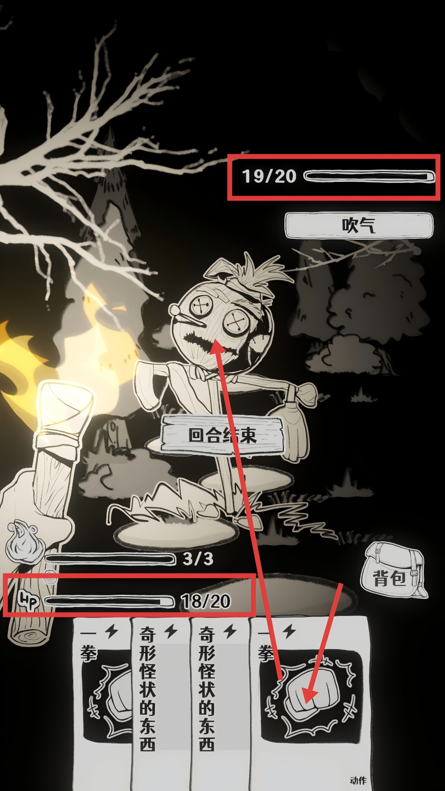 3、战斗中,关注自身【HP-18/20】和敌人进度【19/20】,选择【一拳】等攻击动作输出,也可配合【吹气】等技能,把握回合节奏。