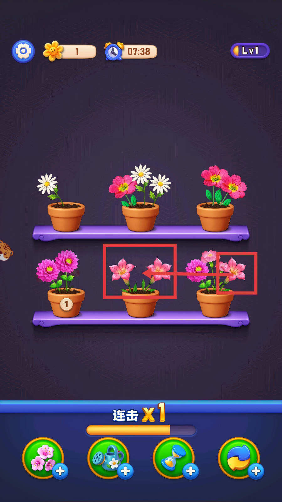 2、在关卡内,将相同种类的花朵拖拽合并,通过合成更高级的花朵来推进关卡,合并操作能让花朵等级逐步提升。