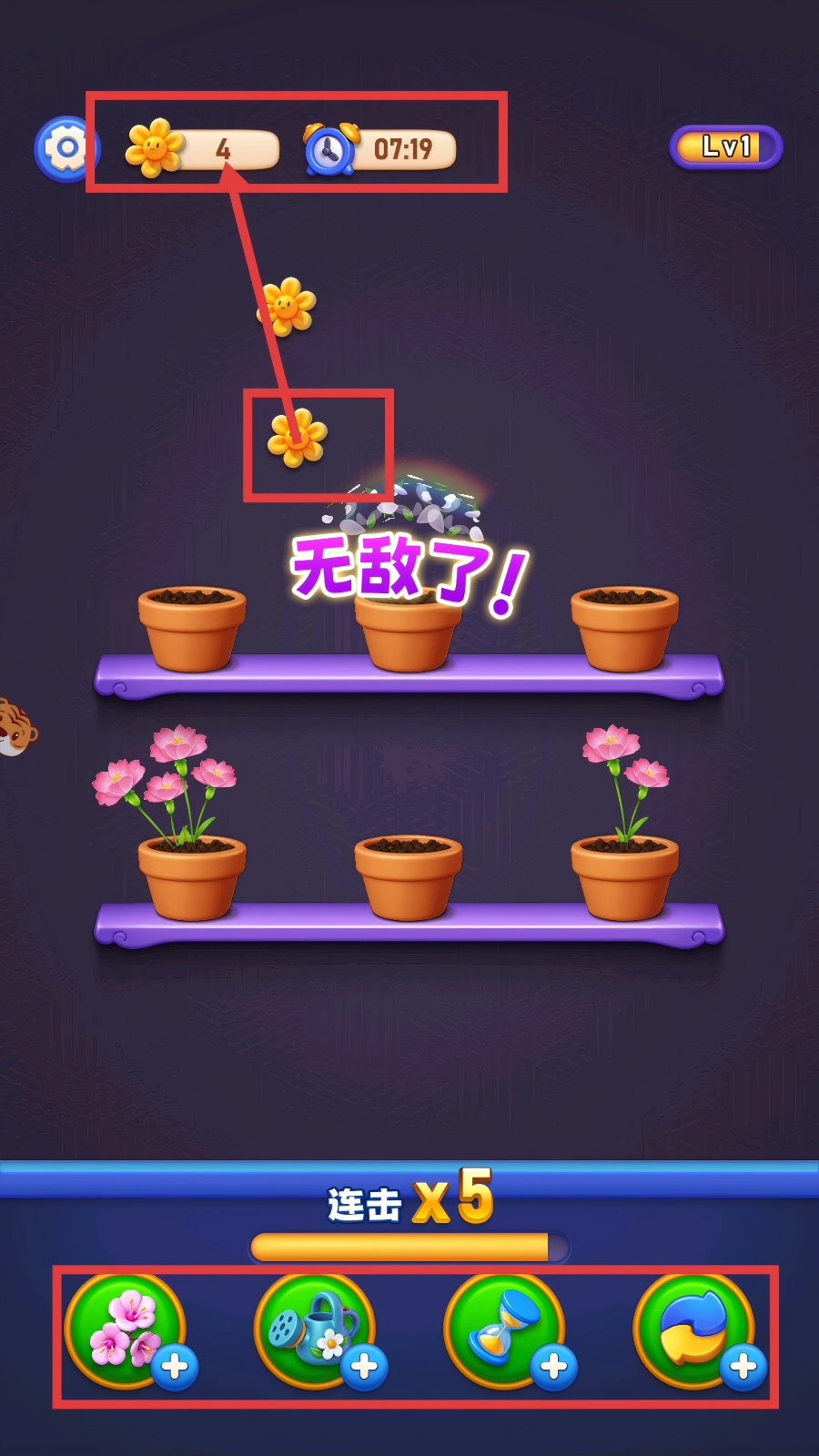 3、过程中收集【黄色花朵】道具可增加上方计数,还能借助底部的花朵、水壶、沙漏等技能道具,更高效完成关卡目标。