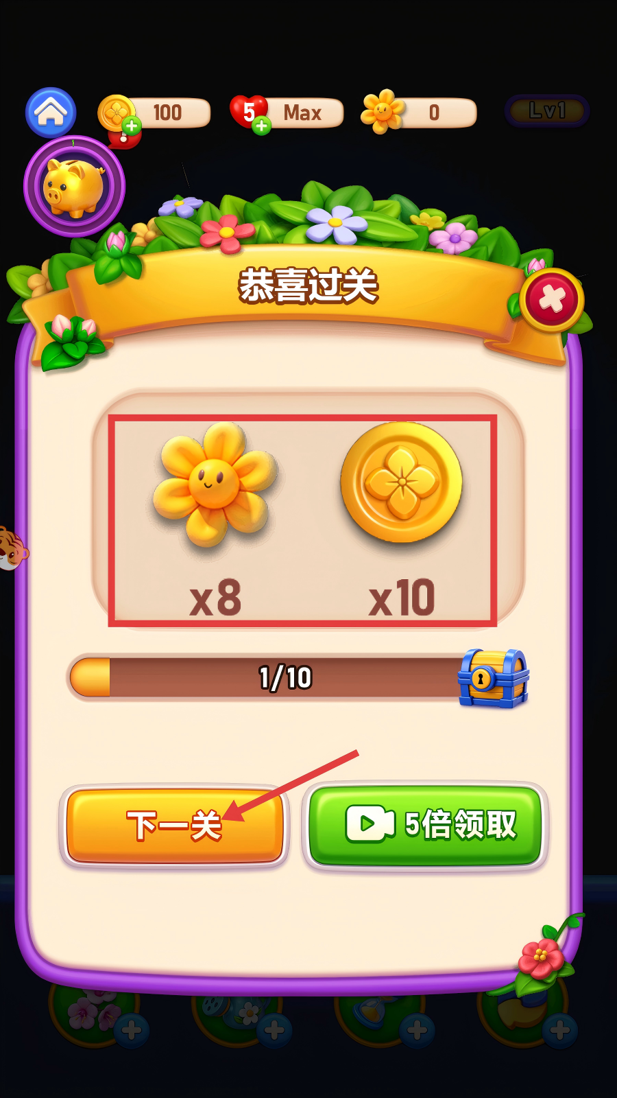 4、通关后领取【花朵-x8】【金币-x10】的奖励,接着点击【下一关】继续挑战,逐步解锁更多关卡以积累更多资源。