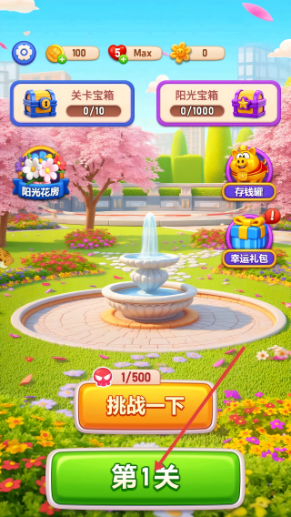 1、进入主界面,优先点击【第1关】开启挑战,同时留意【关卡宝箱-0/10】与【阳光宝箱-0/1000】的进度,为后续获取奖励做准备。