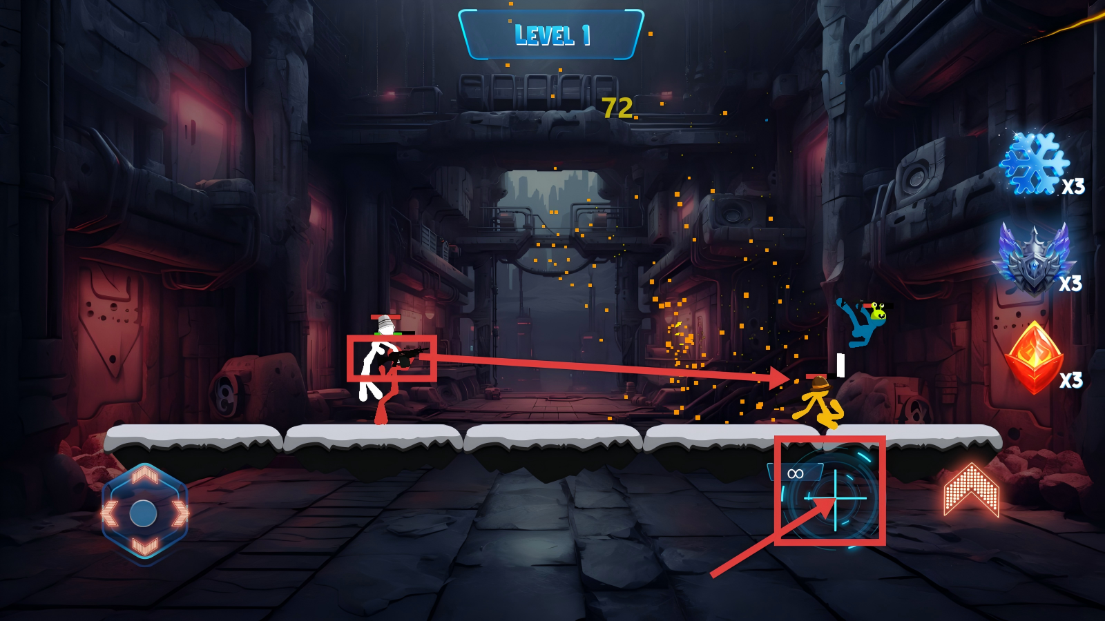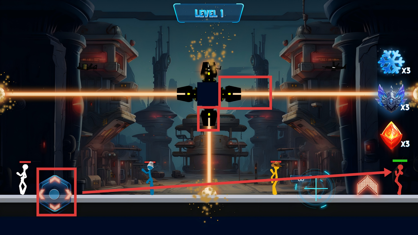2、关卡内左侧可操控角色移动,注意中间敌人的攻击,右侧【雪花】【徽章】【钻石】类技能可辅助战斗,合理利用。
