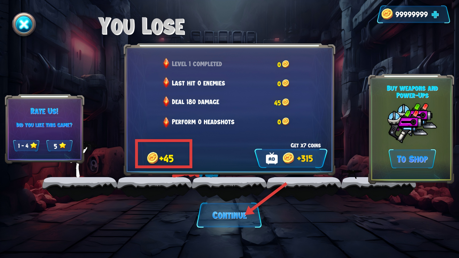 4、若战斗失败出现【YOU-LOSE】界面,可查看本次伤害等数据,点击【CONTINUE】继续游戏,积累的金币还能用于强化。
