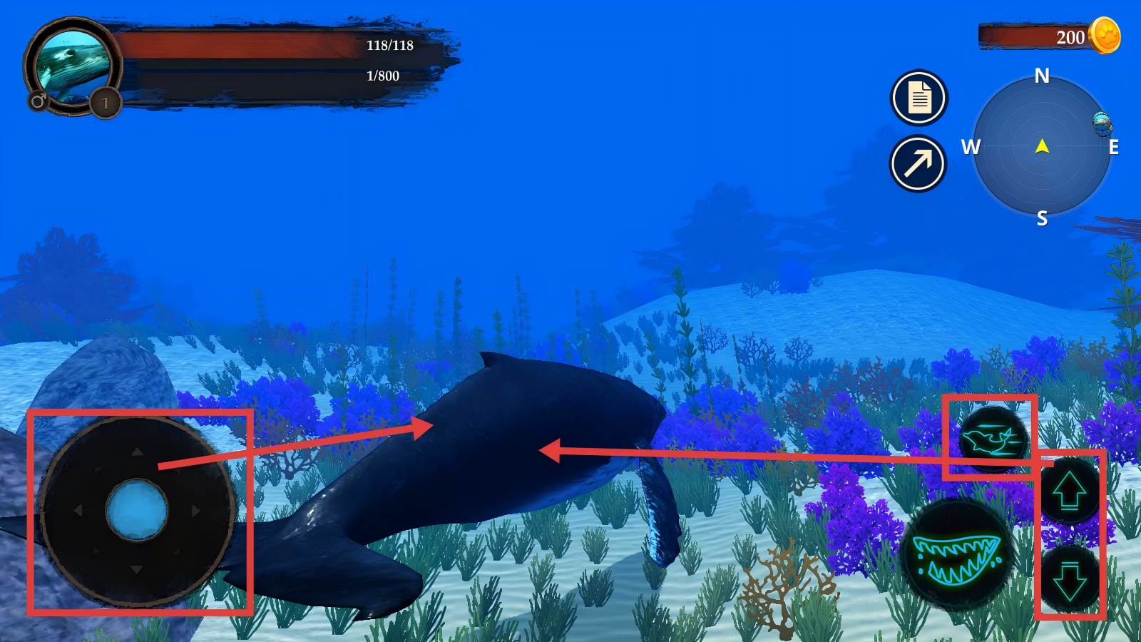 2、使用左侧摇杆操控座头鲸移动,借助右侧方向与技能按钮,熟悉基本操作流程,掌控移动与技能释放。