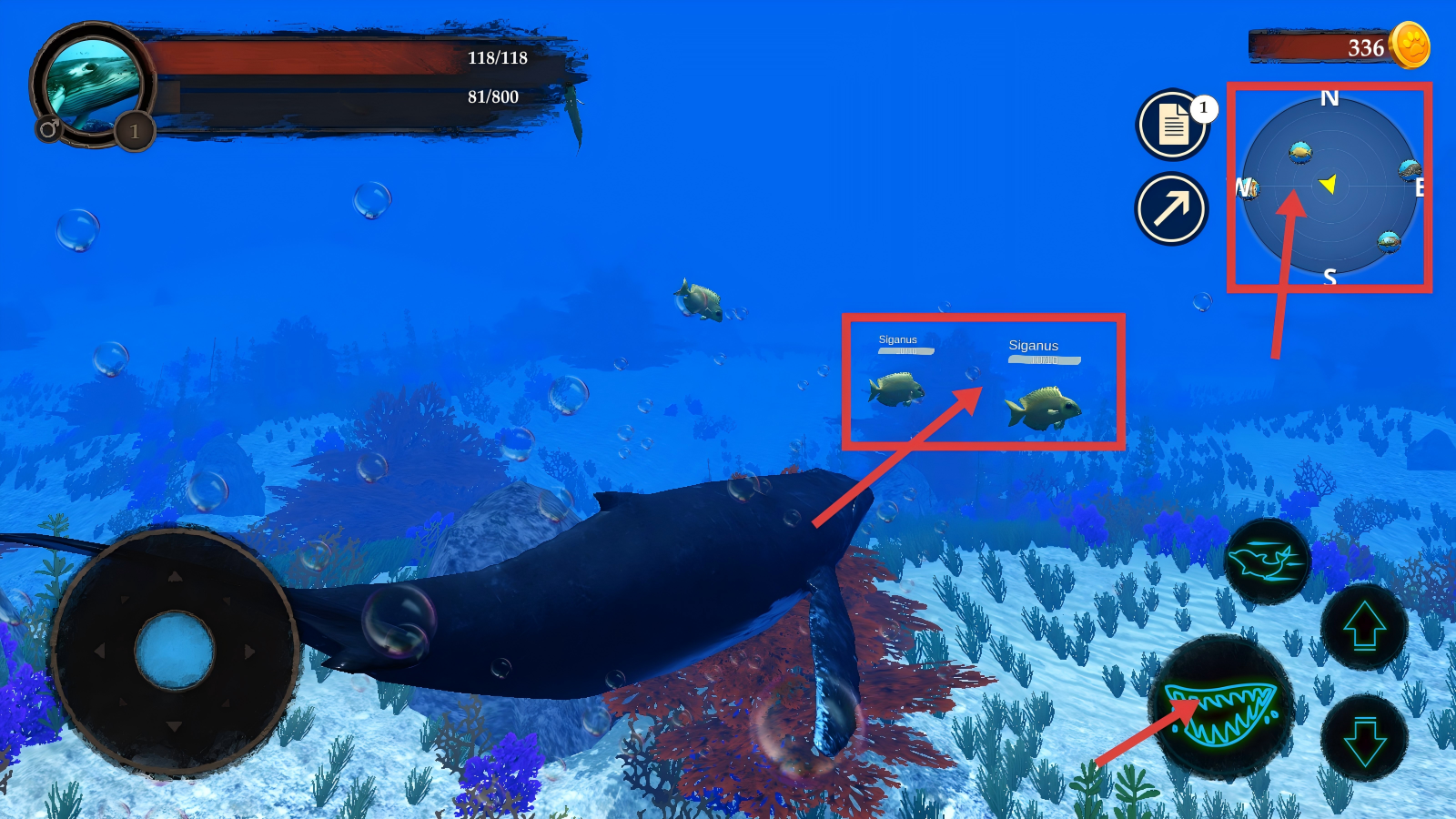 3、根据右上角雷达寻找【Siganus】等鱼类,点击攻击按钮捕食它们,以此获取游戏资源。