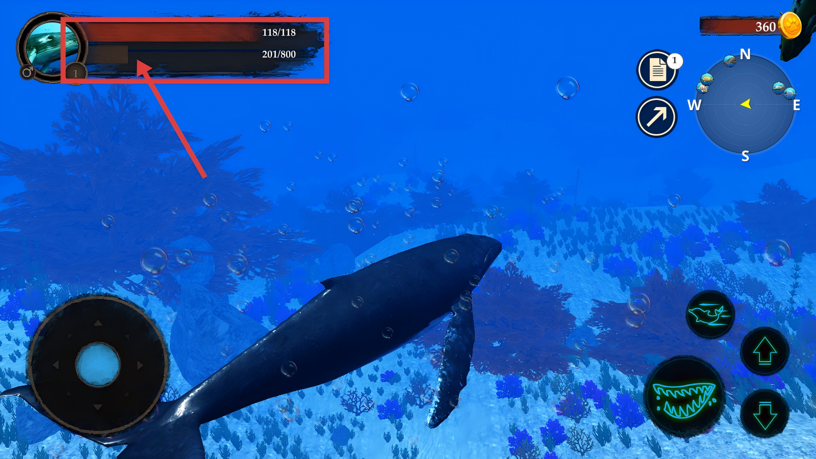 4、留意左上角【118/118】生命与【201/800】成长进度,通过捕食鱼类提升成长值,保持生命状态稳定。