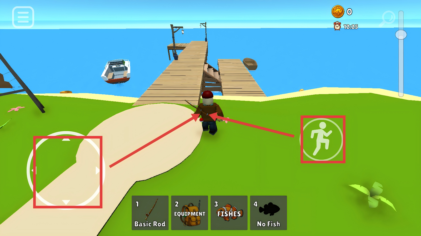 1、用左侧摇杆控制角色移动,点击右侧跑步图标可加速,记得查看下方【Basic-Rod】等初始道具。