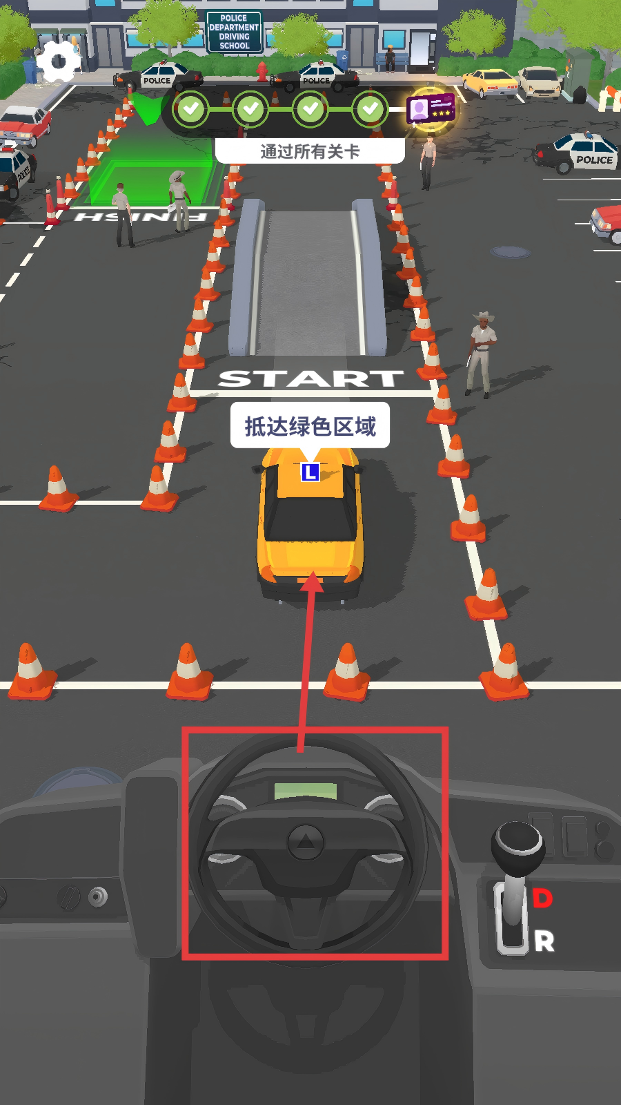 1、操控方向盘,让黄色车辆从【START】出发,沿着路线行驶,目标是前方的绿色区域,开启驾驶考试关卡。
