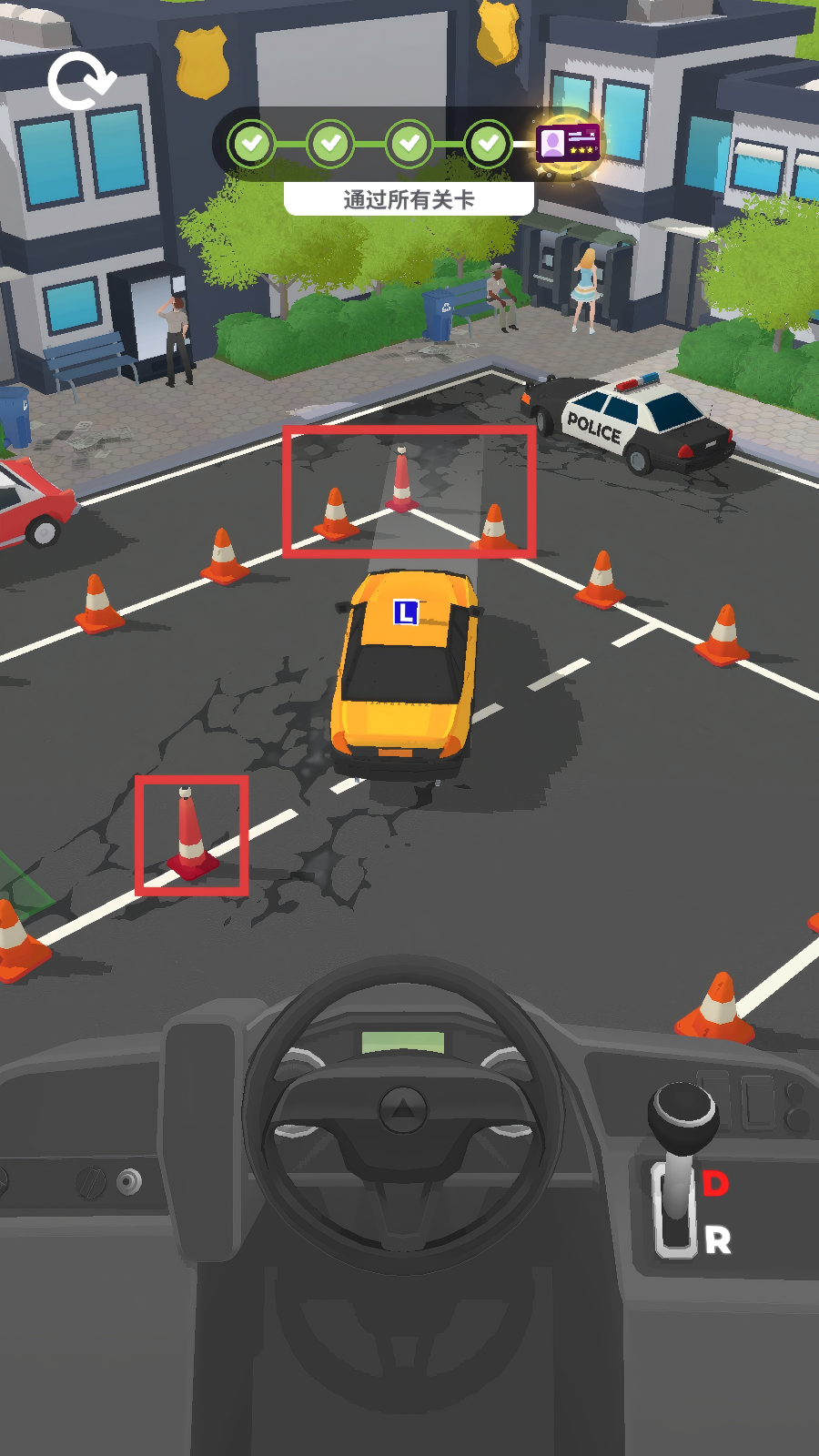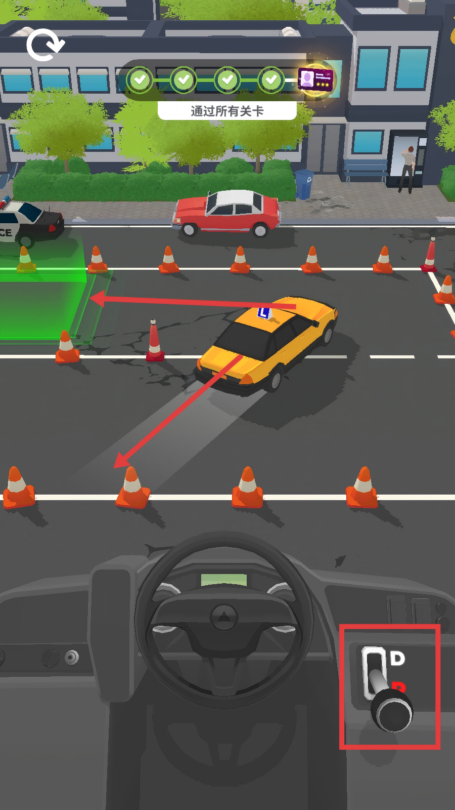 3、依据路况切换挡位(【D】或【R】),调整车辆行驶方向,朝着绿色区域前进,同时避开周围障碍物。