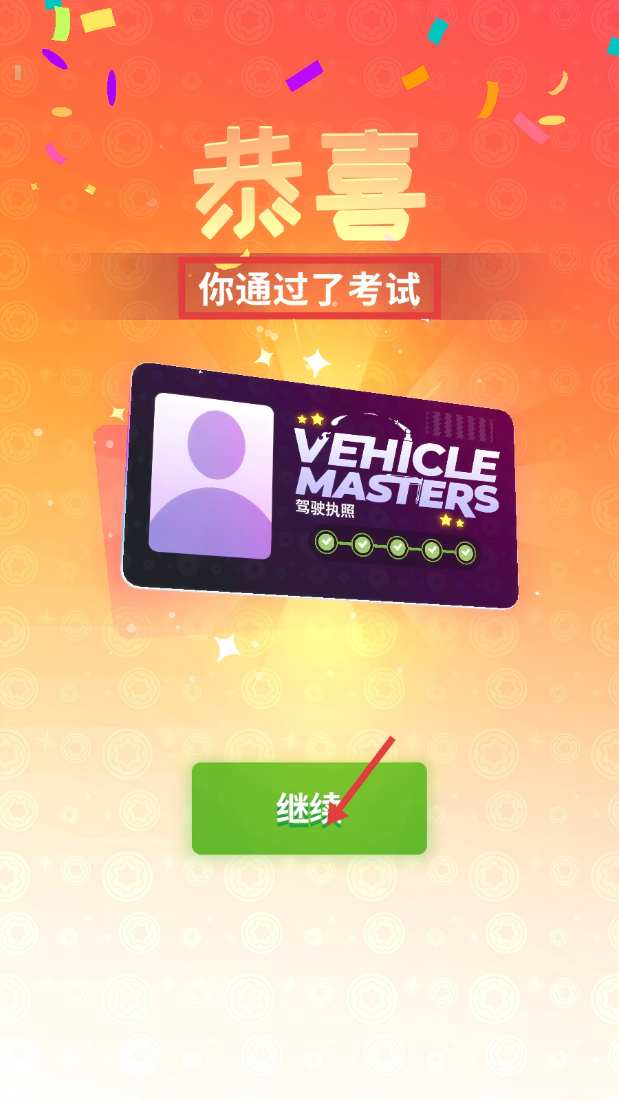 4、成功通过考试后,点击【继续】按钮,可进入后续内容,还能获得【VEHICLE-MASTERS】驾驶执照作为奖励。