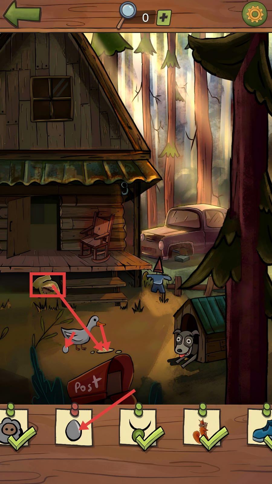 2、来到木屋场景,仔细观察画面,找到与下方道具栏匹配的【车轮】和【骨头】,点击收集它们。