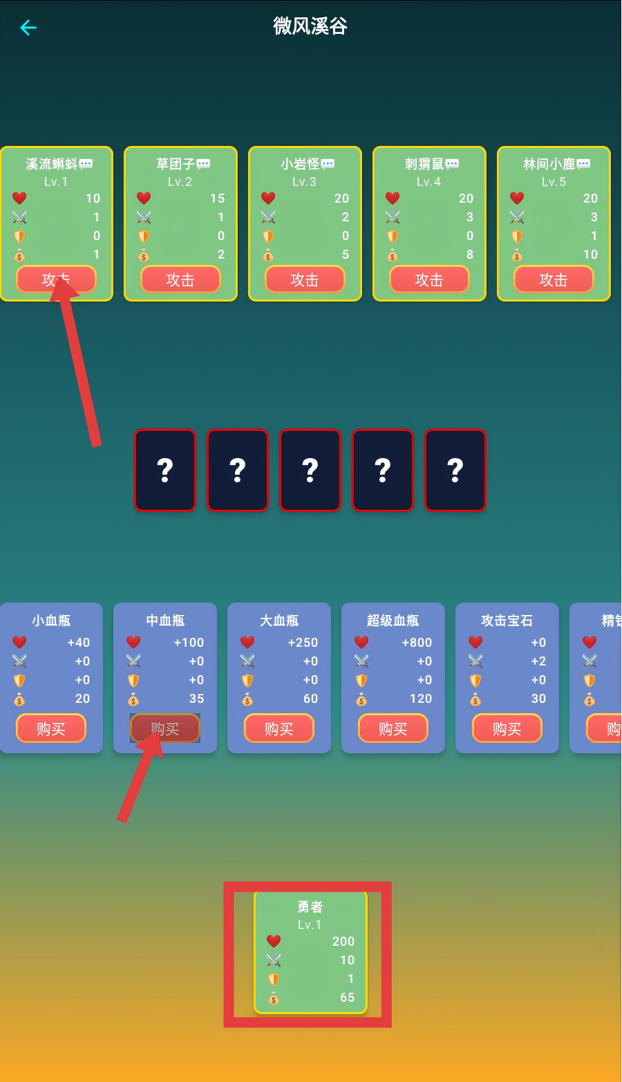 2、在【微风溪谷】,点击怪物卡片的【攻击】按钮挑战怪物,也可购买【中血瓶】等道具提升战力。